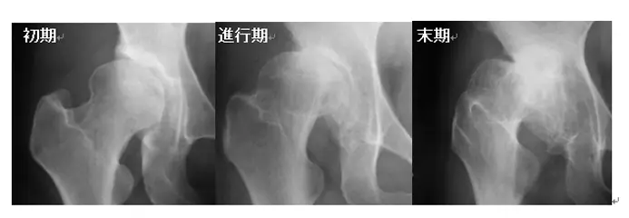 股関節疾患の代表的な疾患である変形性股関節症について説明します。変形性股関節症になる原因は、本邦では寛骨臼形成不全といって、臼蓋による大腿骨頭の被覆が少ないことが原因の場合が多く、女性に多いのも特徴です。その病期は前期、初期、進行期、末期の四段階に分類されています。前期はまだ関節裂隙の狭小などの変化がない状態で、初期は関節裂隙の部分的な狭小や骨硬化・軽度の骨棘形成がある状態、進行期は関節裂隙の部分的消失や骨嚢胞・骨棘形成がある状態、末期は関節裂隙の広範囲な消失や巨大な骨嚢胞・著しい骨棘形成がある状態です(図1)。
