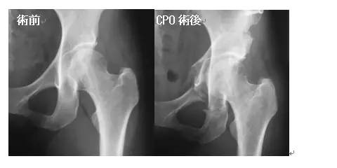 手術概要: 簡単に説明すると、骨盤の臼蓋周囲をドーム状に切り、寛骨臼を前外方に回転させて固定し、臼蓋による骨頭の被覆を良くする手術です。ただし年齢に制限があり、50歳までの患者さんが適応となります。当院では股関節の前方から小さな皮切で行う、CPO(curved periacetabular osteotomy)という術式を行っています。この手術はで股関節外側の筋を切らないので、筋力の回復が早いというメリットがあります。図2に示すように術後股関節の被覆が良くなっていることがわかると思います。この術式は九州でも限られた病院でした受けることができません。