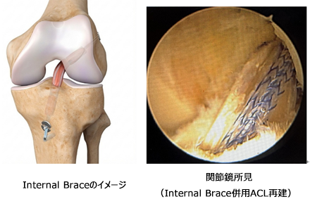 Internal Brace(インターナルブレース)は、前十字靭帯(ACL)損傷の手術で、切れた靭帯を再建する際に、強力な縫合糸(ファイバーテープ)で補強し、治癒を助ける補助的な手法です。主な目的は、早期の可動域訓練を可能にし、より早くスポーツ復帰を促しつつ、再損傷のリスクを減らすことで、通常の靭帯再建術(移植腱を使う方法)と比較して低侵襲で回復を早めることを目指します。