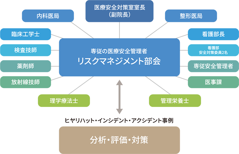 医療安全管理室は、患者様が安心して医療を受けられるよう、病院全体の安全体制づくりを中心となって進めています。