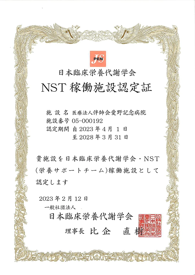 2018年より日本栄養治療学会(旧日本臨床栄養代謝学会)(JSPEN)NST専門療法士教育認定施設として、臨床実地修練を行っています。年1回の実施を計画しており、院外からの研修生も受け入れ、地域のNST活性化に寄与しています。